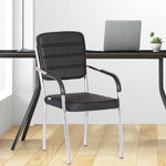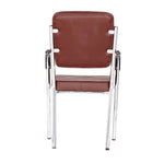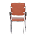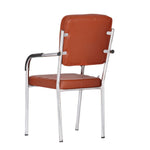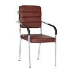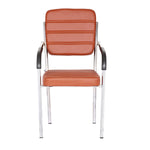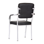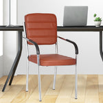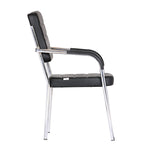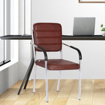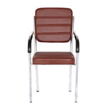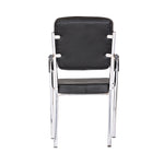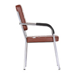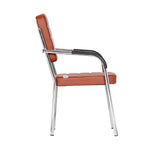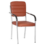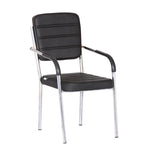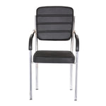 Leatherette Guest Chair Upholstered in Soft thread leatherette for an upscale look and feel. Padded Cushions Padded seat and back cushions provide long lasting comfort. Sled base A sturdy tube frame with padded arms creates the ultimate stability and comfort. This attractive side chair features integrated arms, contoured cushions, and a chrome plated frame sled base that provides added stability. A unique waterfall seat works to reduce leg strain and promote healthy blood flow, and a pair of padded arms provides added support. The chrome plated tubular metal frame is exceedingly versatile and will complement any existing decor.